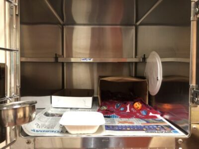 Litter boxes, the room's water jug , trash bags and food bowls are placed on the top. Food is placed on the side of the cart in plastic litter boxes that are labeled on the top of the lids as well as a fold up stool.